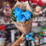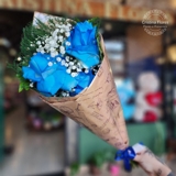 Buquê composto por 3 rosas brancas nacionais tingidas de azul no papel jornal.