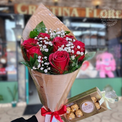- Buquê com 7 botões de rosas nacionais vermelhas, com complemento variavel, finalizado com papel decorado e laço de cetim;