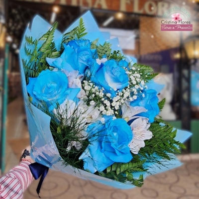 Lindo buquê com sete rosas brancas tingidas de azul, cative quem como os oceanos, te transborda de amor.