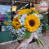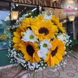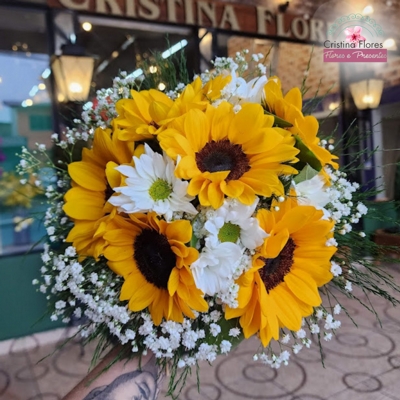 Composto por 6 girassóis, este buquê de noiva ilumina o ambiente com sua presença marcante e vibrante, simbolizando alegria, luz e um amor leve que floresce todos os dias. Ao redor, as margaridas complementares trazem um toque delicado e campestre, reforçando a leveza e o romantismo da composição.