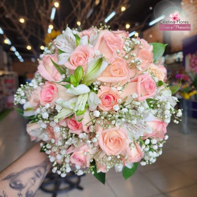 As astromélias brancas entram como um detalhe encantador, trazendo leveza e simbolizando a pureza e a cumplicidade. A gipsofila envolve toda a composição com sua delicadeza, enquanto o aspargo adiciona movimento e um acabamento mais fluido, valorizando ainda mais o conjunto.