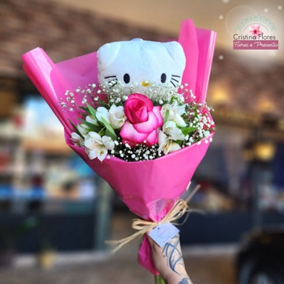 O Buquê Kitty combina a intensidade suave da rosa pink com a leveza das astromélias, criando uma composição romântica e alegre. A pelúcia de Hello Kitty traz um toque lúdico e afetivo, transformando o buquê em algo ainda mais especial e memorável.