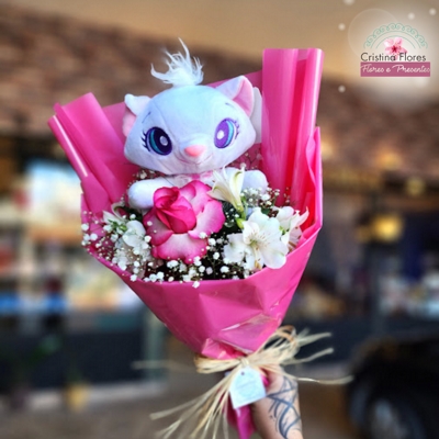 O Buquê Marie une a beleza da rosa pink com a leveza das flores brancas complementares, criando uma composição harmoniosa e elegante. A pelúcia da Gatinha Marie acrescenta um toque doce e sofisticado, tornando o buquê ainda mais especial e memorável.