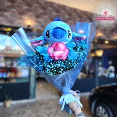 O Buquê Mini Stitch combina a delicadeza da rosa pink com a originalidade dos complementos em tons de azul, criando um contraste moderno e envolvente. A pelúcia do Stitch traz um toque divertido e afetivo, transformando o buquê em uma lembrança única, daquelas que permanecem.