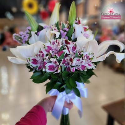 A astromélia roxa surge como um contraste encantador, trazendo profundidade e personalidade ao buquê, enquanto a gipsofila suaviza toda a composição com sua leveza, envolvendo as flores principais como um toque de poesia.
