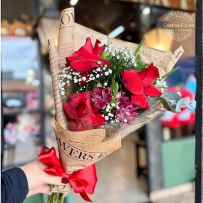 Este buquê é composto por 3 rosas vermelhas acompanhadas de complementos variados, que realçam ainda mais o encanto e a beleza das flores. Finalizado com papel jornal e um laço de cetim, é o presente perfeito para expressar amor, carinho e admiração de forma delicada e sofisticada.