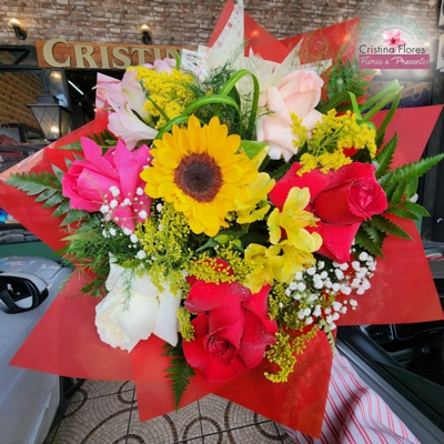 Uma composição que fala por si. O buquê Sol entre Rosas traz a intensidade das rosas vermelhas, a suavidade das rosas cor-de-rosa e o brilho caloroso de um girassol no centro — como um sol gentil entre sentimentos diversos.