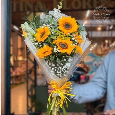 Composto por 6 girassóis naturais, este buquê transmite alegria e energia positiva em cada detalhe. Os complementos variáveis acrescentam textura e elegância, valorizando ainda mais o brilho das flores.