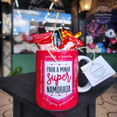 Caneca “Para minha Super Namorada” com 330 ml, acompanhada de 7 bombons variados, embalada em celofane transparente e finalizada com um laço delicado — um presente doce e encantador para surpreender quem ilumina seus dias.