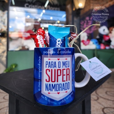 Caneca “Para meu Super Namorado” com 330 ml, recheada com 7 bombons variados, embalada em celofane transparente e finalizada com laço especial — o presente perfeito para demonstrar amor de um jeito doce e divertido.