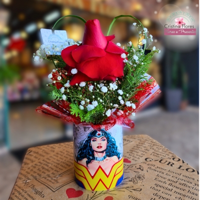 A Caneca Mulher-Maravilha com Arranjo une personalidade e carinho em uma composição única. A caneca temática de 330 ml traz toda a força e inspiração da personagem, enquanto o arranjo floral com 1 rosa vermelha nacional acrescenta um toque de amor e elegância.