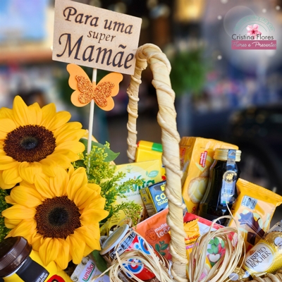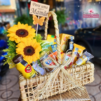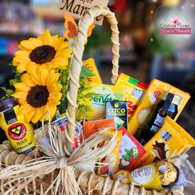 A Cesta Especial de Café com Girassóis combina o charme do estilo rústico com a energia vibrante das flores. O arranjo com 2 girassóis em base floral ilumina a composição, enquanto a plaquinha temática “Mãe” acrescenta um toque emocional e especial.