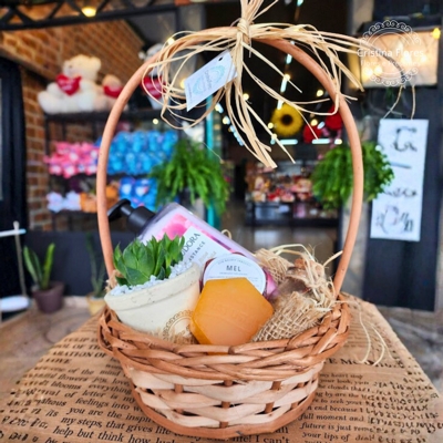 A Cestinha Cuidados reúne gestos simples que fazem toda a diferença: 2 sabonetes artesanais glicerinados de mel, que limpam e hidratam com suavidade; 1 escalda-pés, perfeito para relaxar o corpo e a mente; 1 mini suculenta no vasinho, símbolo de cuidado contínuo e carinho que cresce; e 1 hidratante Eudora Instance, para envolver a pele com conforto e bem-estar.