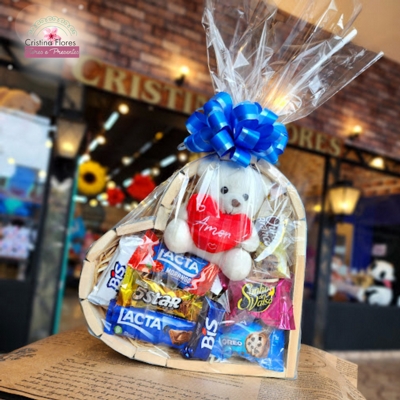 O Coração de Amor é uma composição pensada para encantar desde o primeiro olhar. A base em madeira traz um toque acolhedor e elegante, enquanto o chaveiro de pelúcia com coração adiciona um gesto afetivo que pode ser levado para o dia a dia. A caixa de bombons variados completa o conjunto com doçura, tornando a experiência ainda mais especial.