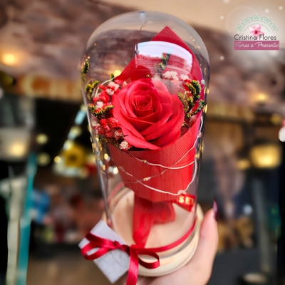 A Cúpula com Mini Buquê traz um arranjo especial com 1 rosa vermelha artificial, montada como um pequeno buquê dentro de uma cúpula de acrílico com iluminação em LED. A composição cria um efeito visual único, destacando a beleza da rosa e tornando o presente ainda mais marcante.