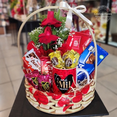 Cesta de chocolates e rosas, ideal para presentear quem amamos.
