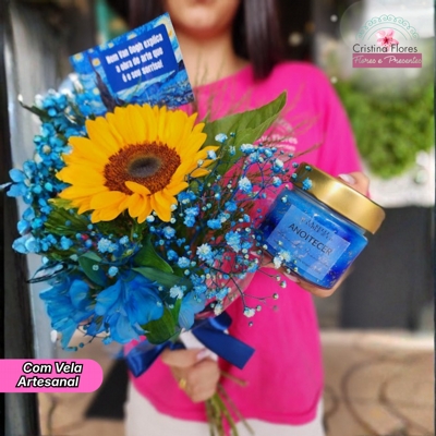 Com um girassol radiante, envolvido por delicados complementos em tons de azul, esse buquê encanta em cada detalhe. Acompanha uma mini arte inspirada em Vincent van Gogh com a frase: “Nem Van Gogh explica a obra de arte que é seu sorriso” — tornando o momento ainda mais especial e inesquecível.