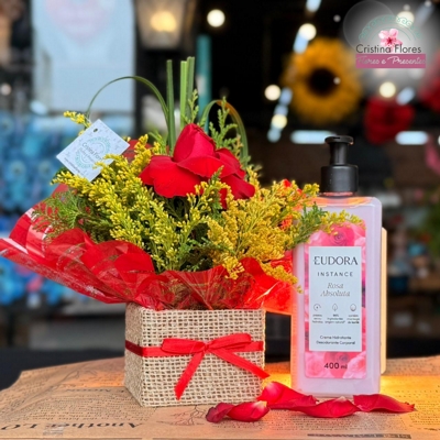 Com uma rosa vermelha nacional, símbolo clássico da paixão, acomodada em um charmoso cachepô de juta com arranjinho, ele ganha um toque especial com hidratante Eudora 400ml — perfeito para cuidar e encantar ao mesmo tempo.