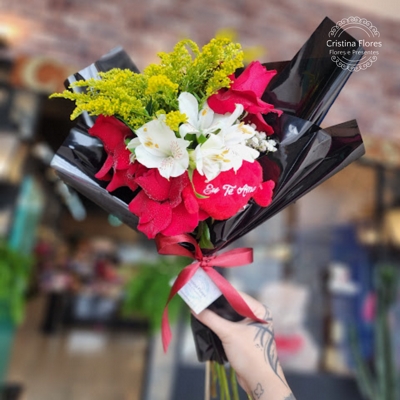 O Mini Buquê Eu Te Amo é composto por 3 rosas vermelhas nacionais, que simbolizam amor, carinho e intensidade, acompanhadas de um mini coração de pelúcia com a mensagem “Eu Te Amo”.