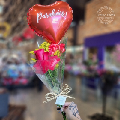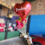 Uma rosa vermelha envolta em carinho, acompanhada de um balão pequeno em formato de coração com a mensagem "Parabéns", perfeito para celebrar momentos especiais.