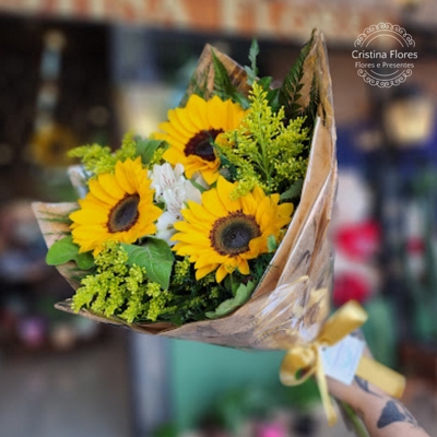 Um buquê cheio de luz e charme retrô: três girassóis radiantes, acompanhados de complementos florais que variam conforme a estação, embalados com todo o cuidado em papel jornal pardo — aquele toque rústico que remete ao aconchego do passado. Uma escolha perfeita para quem ama o brilho do campo com uma pitada de nostalgia.